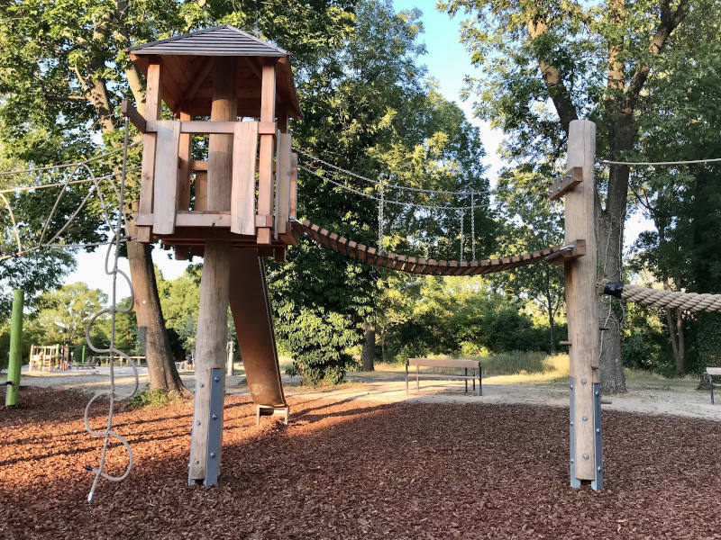 Direkt neben den Tischtennis-Tischen ist auf Rindenmulch eine tolle Kletterlandschaft mit vielen verschiedenen Seilelementen in unterschiedlicher Höhe aufgebaut. Über das dicke Tau und die Seilleiter bis hinauf zum Spielhäuschen können Kinder hier ihr Geschick erproben und ihre Balancierfähigkeiten erweitern.