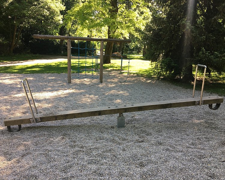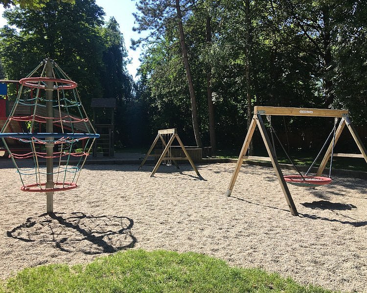 Das Herzstück am Spielplatz ist das riesige Klettergerüst von dem auf unterschiedlichen Ebenen gleich zwei Rutschen abgehen. Aber auch klassische Schaukeln, eine Korbschaukel, mehrere Kletternetze und eine Wippe gibt es. Die großen Bäume rundherum spenden Großteils Schatten, so kann man sich leicht zurückziehen wenn es in der Sonne mal zu heiß wird. Auch zum Fangen oder Verstecken spielen bietet der Spielplatz und seine Umgebung genügend Platz. Der Spielplatz ist nicht extra abgezäunt. In Spielplatznähe befindet sich auch eine Trinkwasserpumpe und ein öffentliches WC. Es ist kostenlos und einigermaßen sauber, einen Wickeltisch gibt es leider nicht.