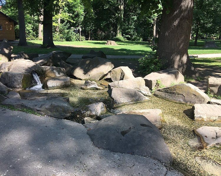 Für die Jüngeren gibt es eine kleine Rutsche, Schaukeln und Wipptiere. Auch eine Sandgrube gibt es natürlich und ein kleines Spielhaus. Neben dem Bereich für die Kleinen befindet sich ein kleiner Wasserbereich. Hier fließt das Wasser aus einem Brunnen über ein paar Steine in eine seichte Wasserfläche. Die Steine laden Gleichgewichtsjunkies zum Balancieren ein und die sehr seichte Wasserfläche kann für ein bisschen Planschen und Abkühlung genutzt werden.