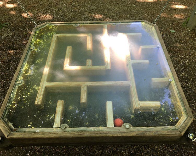Auf dem restlichen Parkgelände sind mehrere Spielgeräte für alle Altersstufen verteilt. Diese sollen Spaß machen und zum trainieren anregen. Mich hat ganz besonders das Balancebrett mit Labyrinth begeistert. Hier steht man auf dem Brett, das zwischen vier Stehern an Seilen befestigt ist und in der Luft hängt. Unter der Plexiglasscheibe befindet sich ein Kugellabyrinth. Hier könnt ihr nun versuchen die Kugel durch das Labyrinth zu bewegen. Das ist gar nicht so leicht, macht dabei aber wahnsinnig Spaß und trainiert so ziemlich alle Muskeln im Körper. Ein weiterer Balanceakt sind die Slacklines die zwischen mehreren Baumstümpfen gespannt sind. Auf der Multifunktionsfläche kann man z. B. Boccia, Schach und ähnliches spielen, wenn man die benötigten Utensilien mitbringt. Über den Automaten von Sportogo kann man auch vor Ort Sportgeräte kostenpflichtig ausleihen.