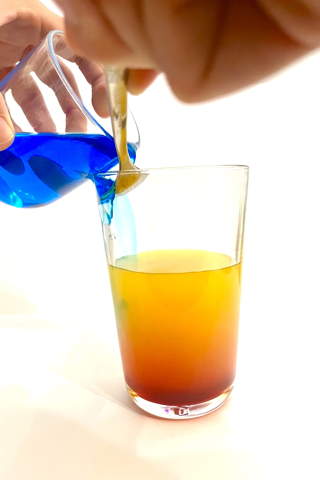Nun fehlt nur noch dein blaues Zauberwasser. Gieße es ganz langsam über einen Löffel oben in dein Glas. Wenn du dir Zeit lässt, vermischen sich die Schichten kaum und du bekommst einen richtig schönen Regenbogen-Effekt.