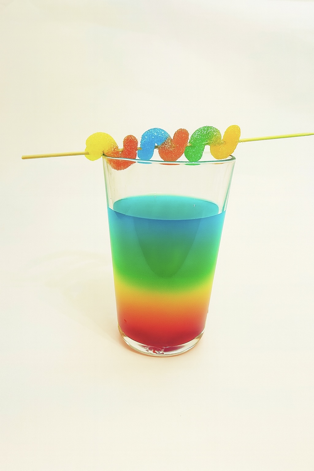 Zum Schluss steckst du die Gummiwürmer auf einen Holzspieß und legst ihn quer über das Glas. Schon sieht dein Zaubertrank aus wie ein echtes Regenbogen-Getränk aus einer magischen Welt!