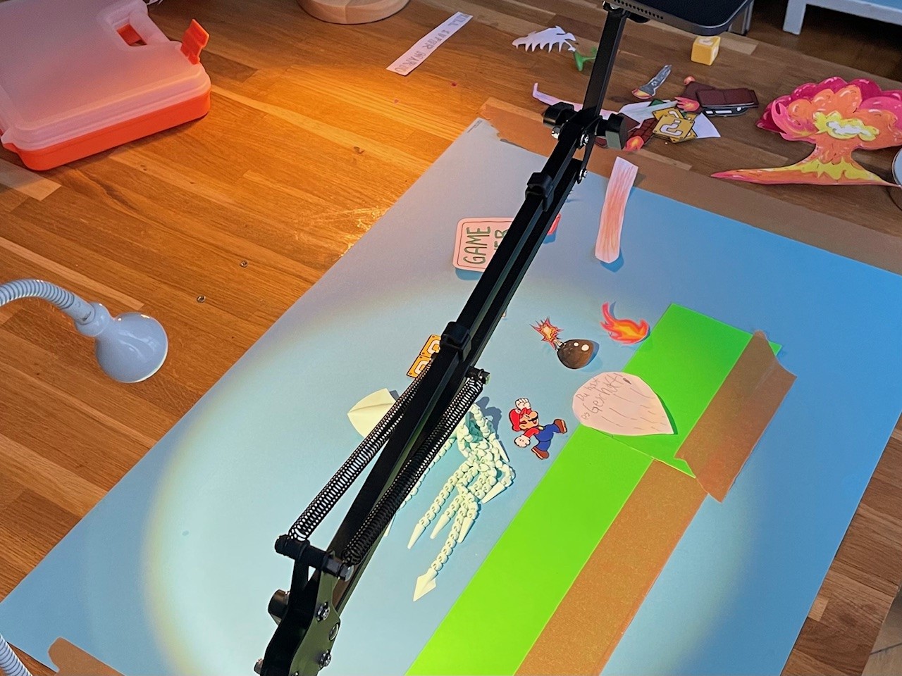 - Figuren vorbereiten: Überlegt euch welche Figuren und andere Elemente ihr braucht. Wir haben Super Mario Magnete und 3D gedruckte Monster und auf Papier gemalte Elemente wie Feuer, ein Game over Schild und Sprechblasen verwendet .