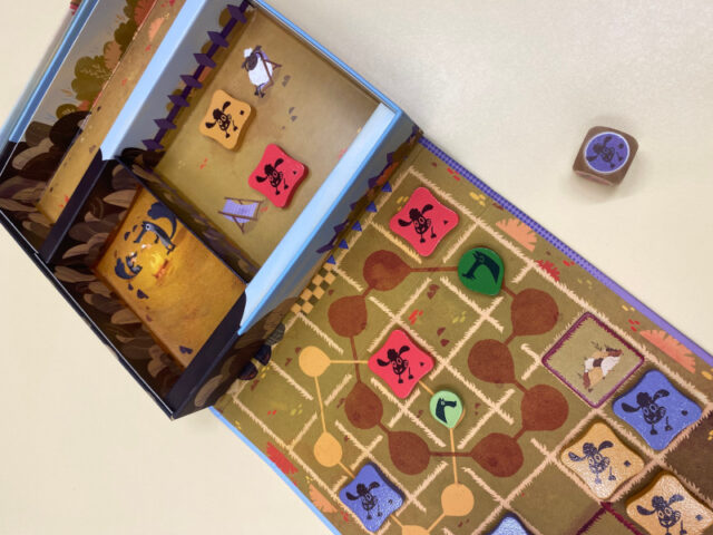 Die Feindschaft zwischen Schafen und Wölfen ist altbekannt und lebt in diesem kooperativen Kinderspiel neu auf. Die Schäfchen wollen entspannt zur Weide, doch dazwischen lauern zwei Wölfe.