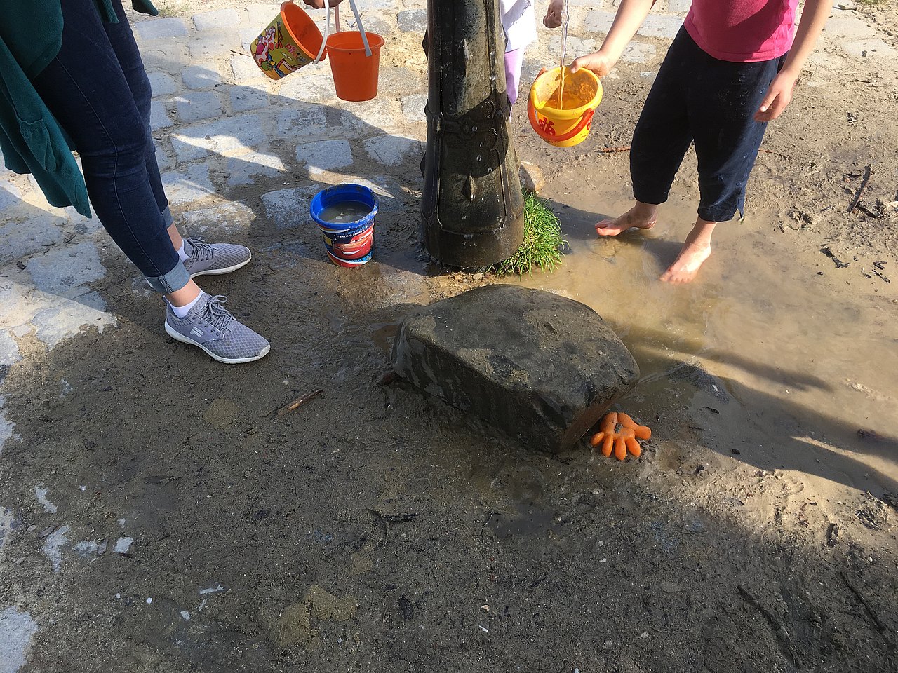 Wie auf der „Ranch“ ist hier nichts eingezäunt und der Spielplatz geht einfach in die Wiese über. Zentral ist hier der Sand-Wasser-Bereich, der die Mitte des Spielplatzes bildet. Er ist flach und groß und teilweise beschattet. In der Mitte ist ein kleines Klettergerät aus Holz und dazwischen gibt es große Steine zum Sitzen. Auf einer Seite schließt daran eine wirklich beeindruckende Pendelschaukel an. Sich dort vom Rand hinunter zu schwingen ist schon beinahe eine Mutprobe und macht nicht nur den Kindern Spaß.