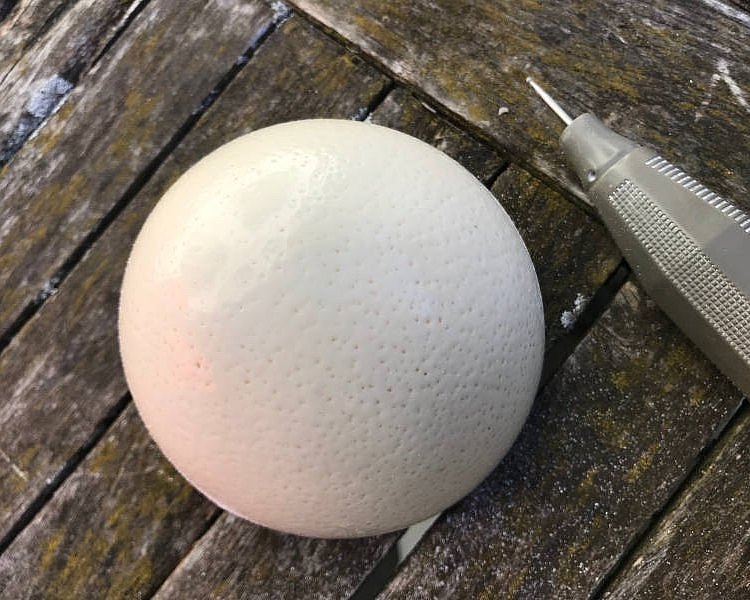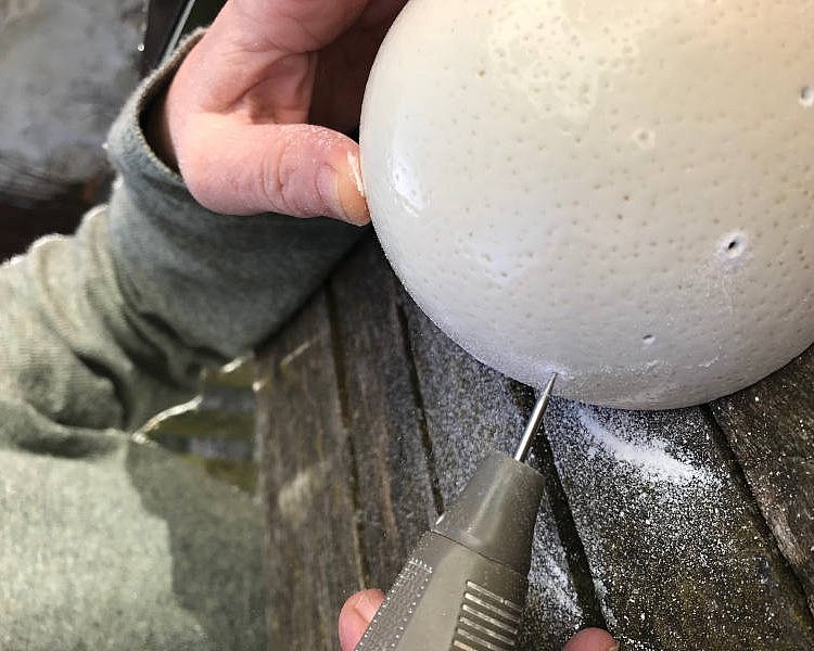 - Dann geht es ans Ostereier bohren. Dabei braucht ihr auch gar nicht so viel Druck auszuüben, ganz im Gegenteil. Setzt den Borer leicht schräg an und bohrt zuerst eine kleine Vertiefung und erst dann das Loch, indem ihr den Bohraufsatz frontal aufsetzt. Bohrt zuerst das Loch, denn da sind manchmal kleine Haarrisse und ein Teil bricht plötzlich raus. Das ist ganz besonders schade, wenn das Teil groß ist und ihr schon viel daran gearbeitet habt.