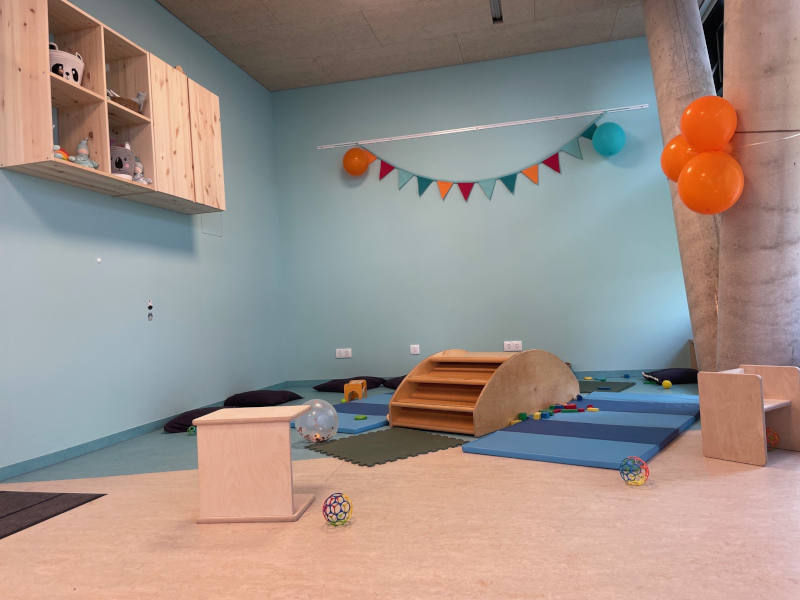 In einem großen Raum können Kleinkinder den Bewegungsbereich erkunden, sich am Kaufmannsladen vergnügen oder die Autos am Spielteppich um die Wette fahren lassen. Auch einen Bastelbereich mit Zeichenmaterial ist vorhanden und lädt zum Erkunden ein.