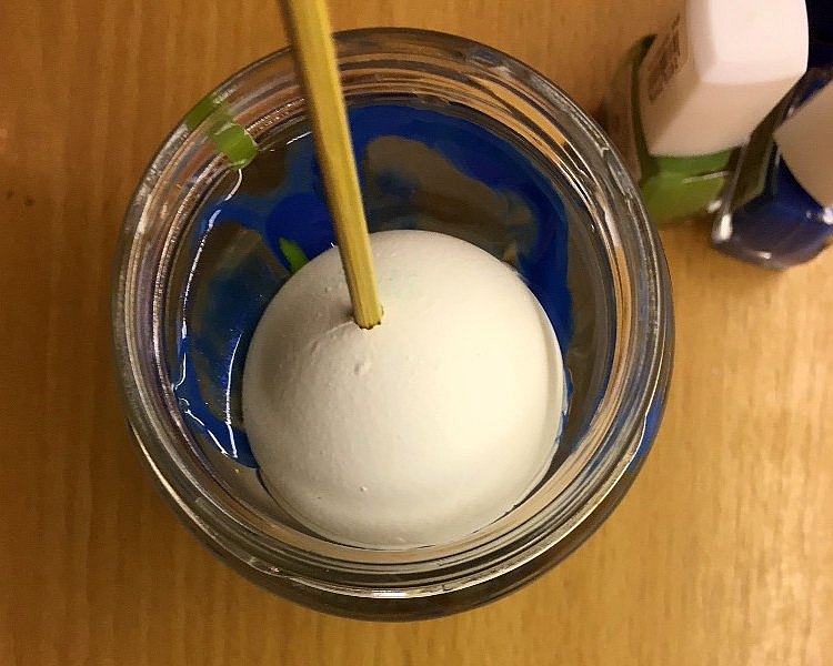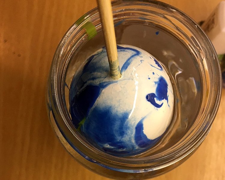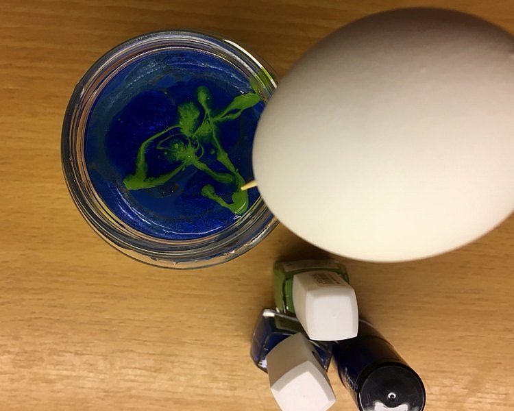 - Dann müsst ihr schnell sein: Taucht das Ei vorsichtig in die Wasser-Nagellack-Mischung, dreht den Spieß, sodass das Ei rundherum gefärbt wird, und holt das Ei am Spieß dann vorsichtig aus dem Wasser.