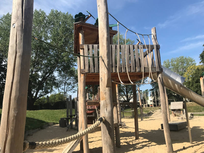 Klar, mit Fantasie wird jeder Spielplatz zum Abenteuerspielplatz. Und nebenbei gibt es in Wien wirklich viele toll gestaltete Spielplätze, die mit Wikingerschiff, Westernstadt, Pirat*innenspelunke oder Floss abenteuerliche Spielwelten bereitstellen. Hier am Robi, wie ihn die Kinder liebevoll nennen, ist schon am Eingang klar, dass er etwas Besonderes ist.