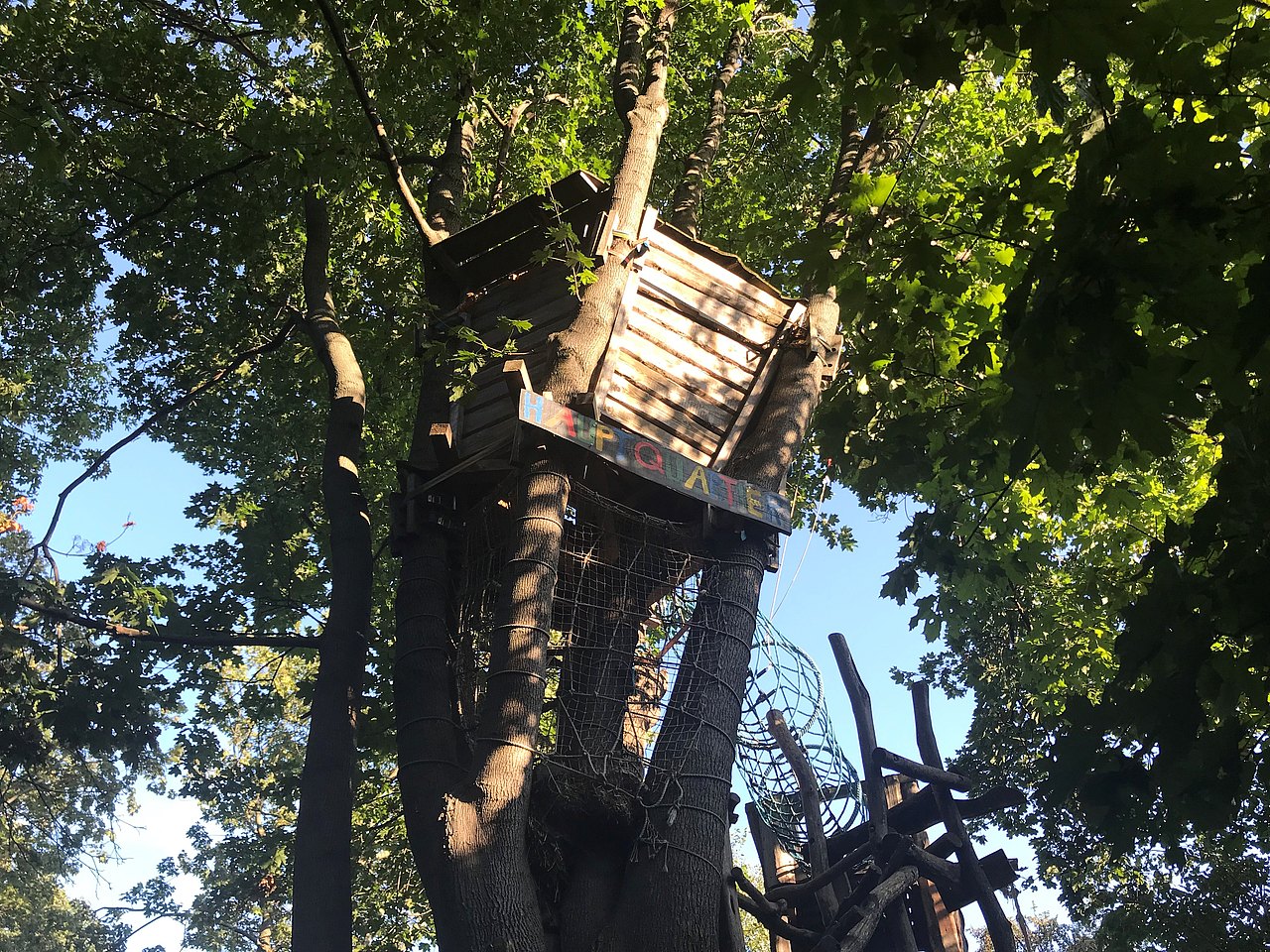 Und ganz oben ist das Hauptquartier, von dem die Mutigen einen Blick auf das Blätterwerk und das lustige Treiben dazwischen werfen können. Außerdem gibt es auch einen Lehmofen und die Feuerstelle, auf welcher man bei einem Geburtstagsfest Mais, Marshmallows oder Würsteln grillen kann.