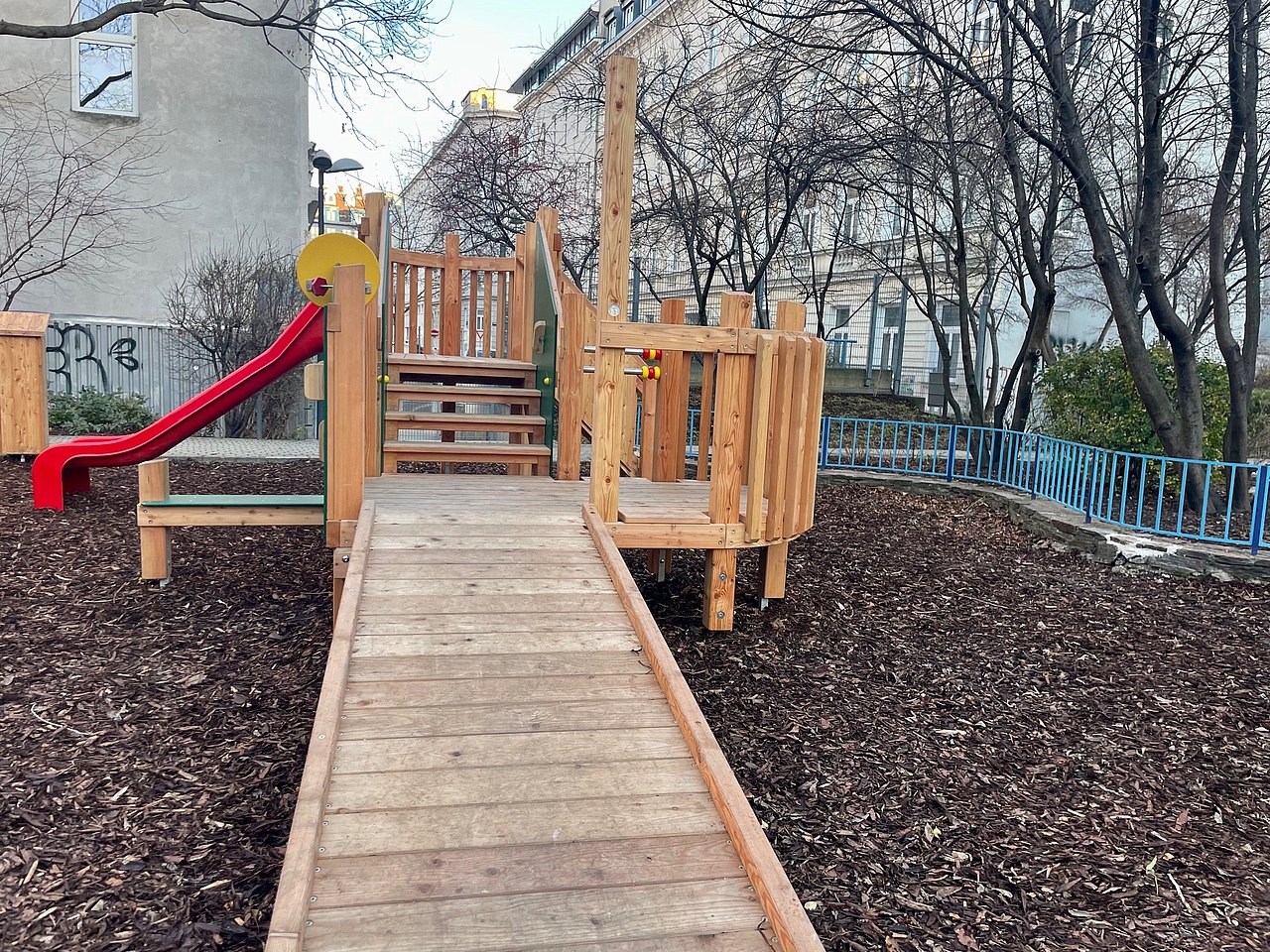 Der Rudolfspark im 1. Bezirk bietet Kindern im Rollstuhl eine befahrbare Holzwippe und eine stufenlos erreichbare breite Rutsche, die auch gemeinsames Rutschen möglich macht. Der größte Teil des Spielplatzes ist mit Fallschutz ausgelegt. Die nächste barrierefreie WC-Anlage ist am Schwedenplatz ca. 10 Minuten entfernt.