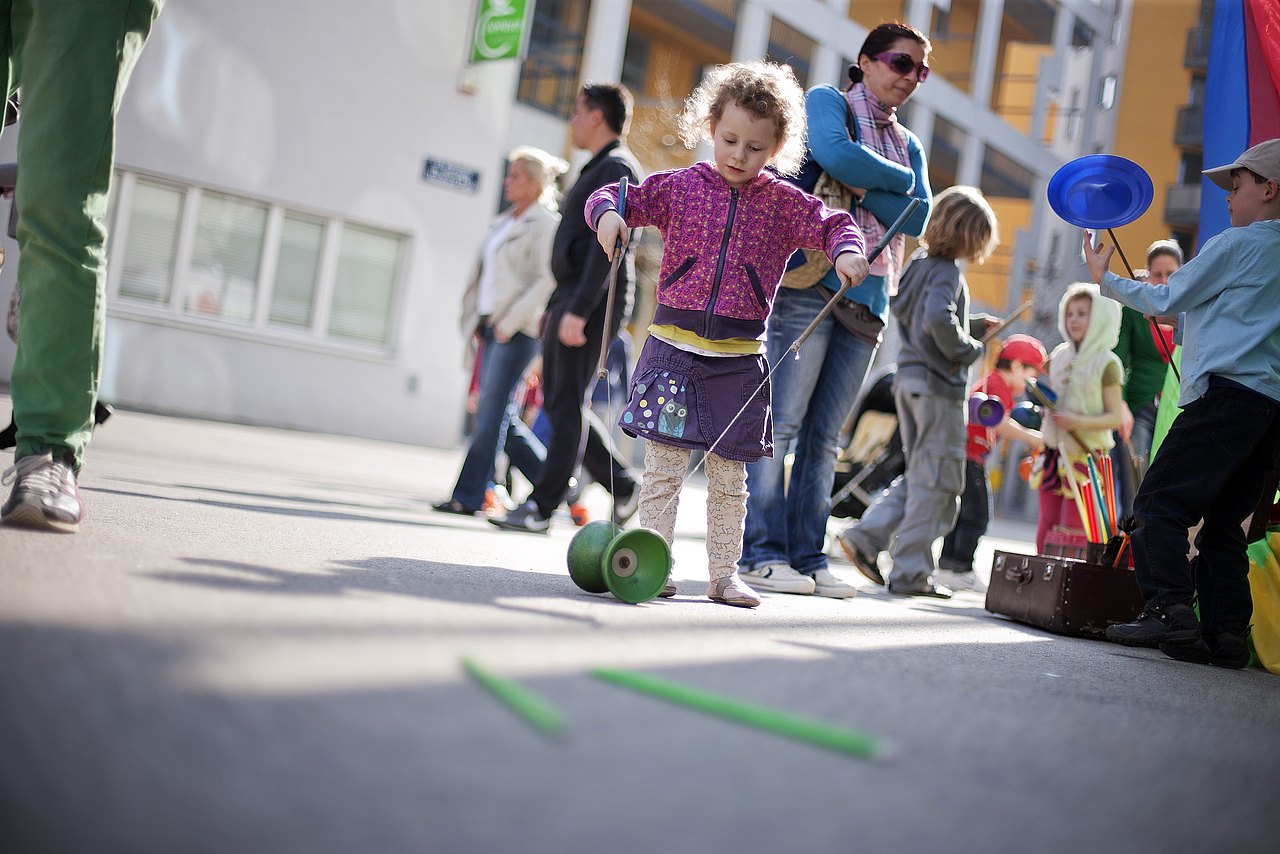 Bei mir in der Nähe sind der Naschmarkt und der Karlsplatz, wo abends Kleinkinder Fahrradfahren üben, größere Kids mit dem Roller herumflitzen und Jugendliche mit Skateboards halsbrecherische Sprünge wagen. Oft gibt es auch in Parks Freiflächen und Wege, die ideal für Straßenspiele sind.