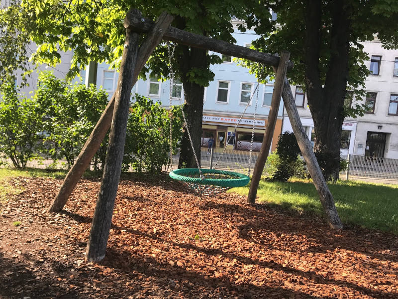 Der Theodor-Körner-Park ist bis auf den Radweg-Ausgang umzäunt. Außer den Wasserspielen ist die Nestschaukel für jüngere Kinder ein Anziehungspunkt.