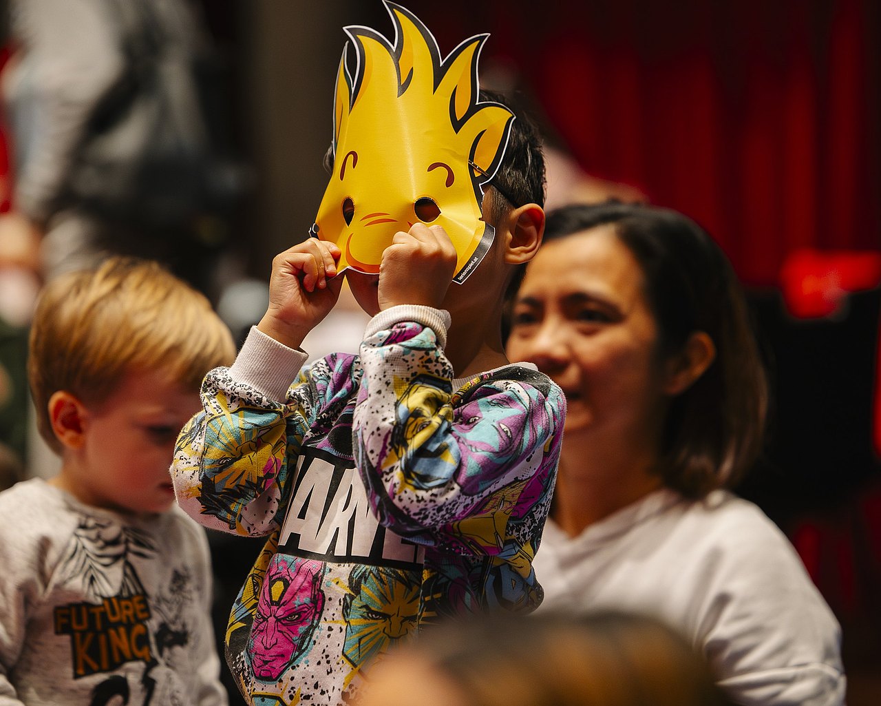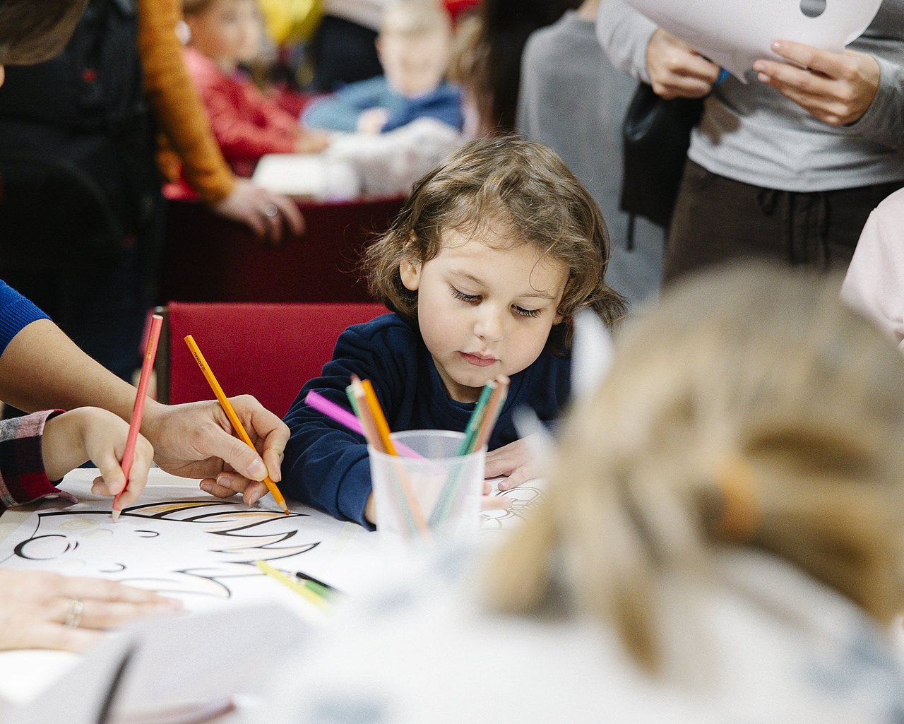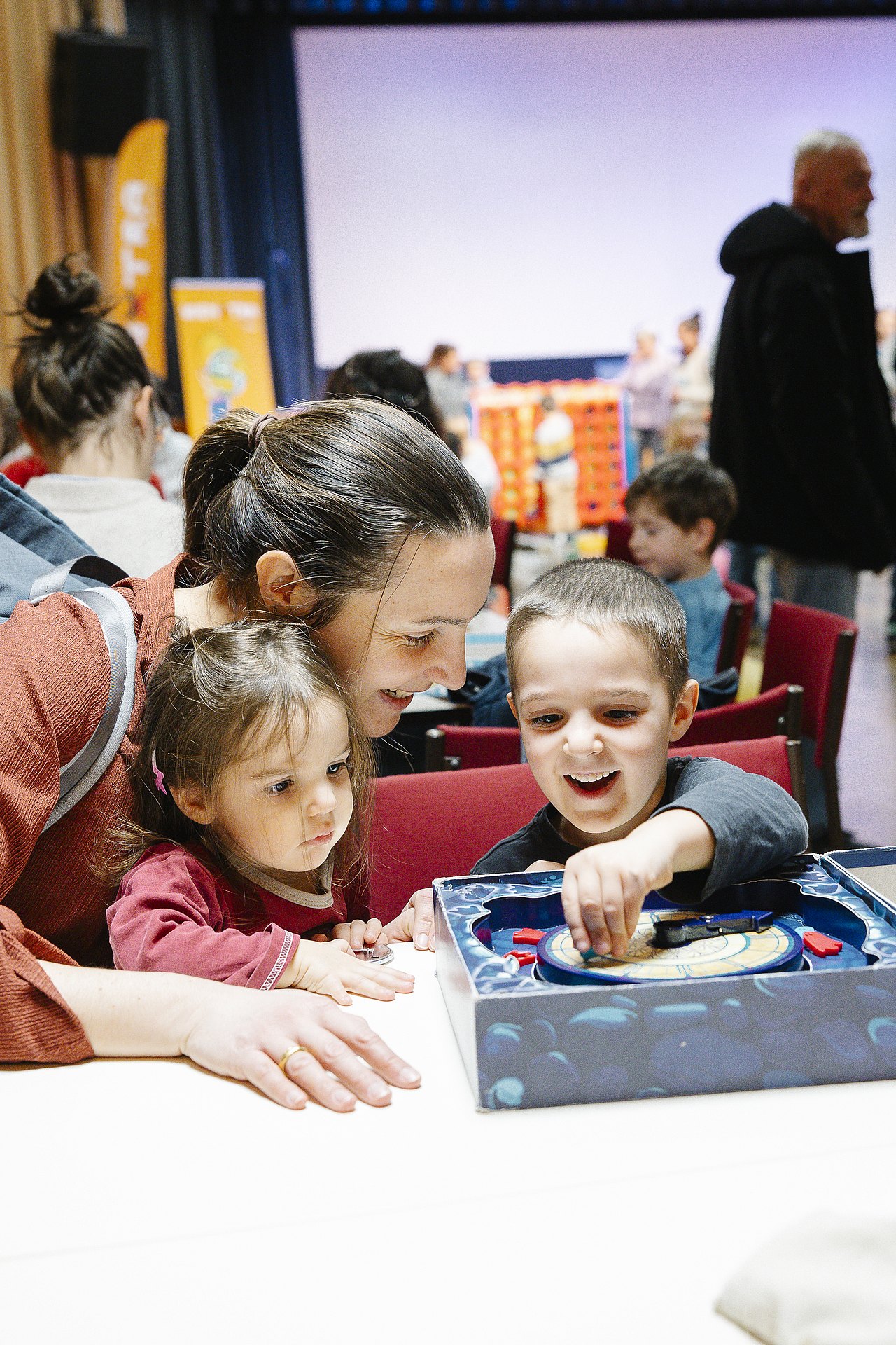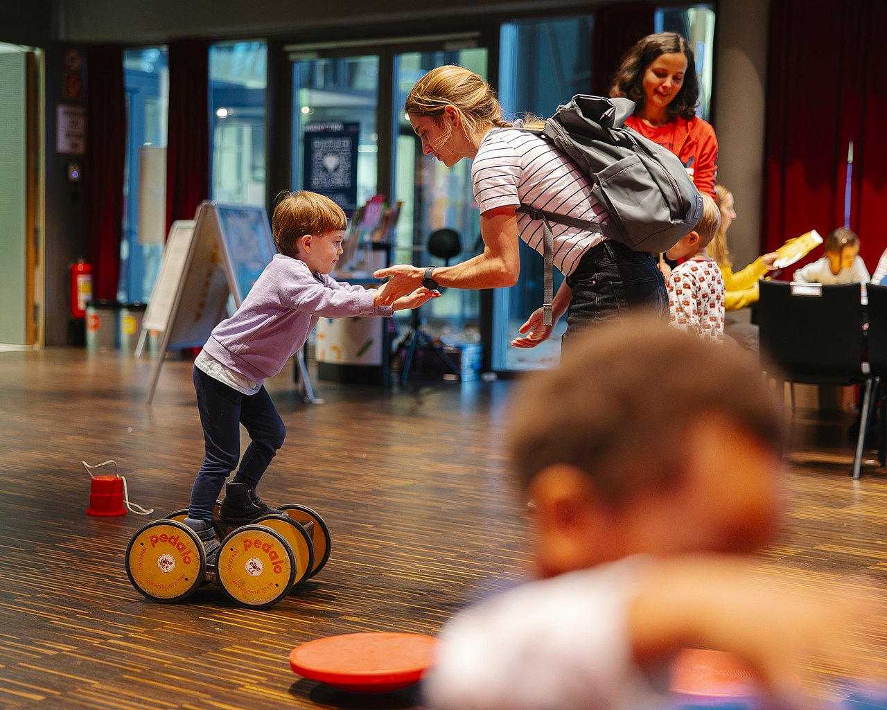 Kind hält rote Becherstelzen hoch, verschiedene Spielzeuge und weitere Personen im Hintergrund
