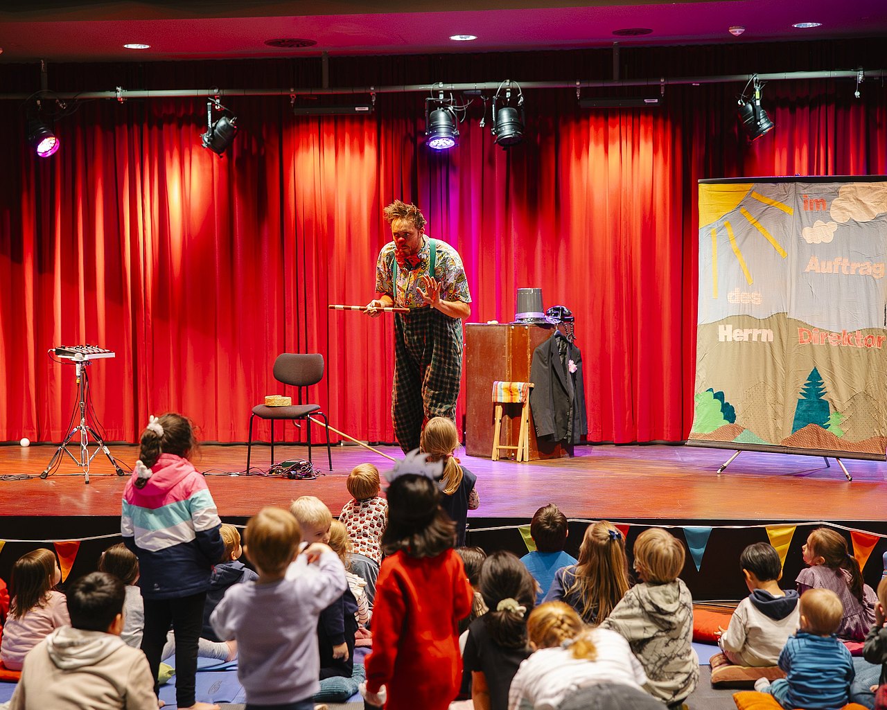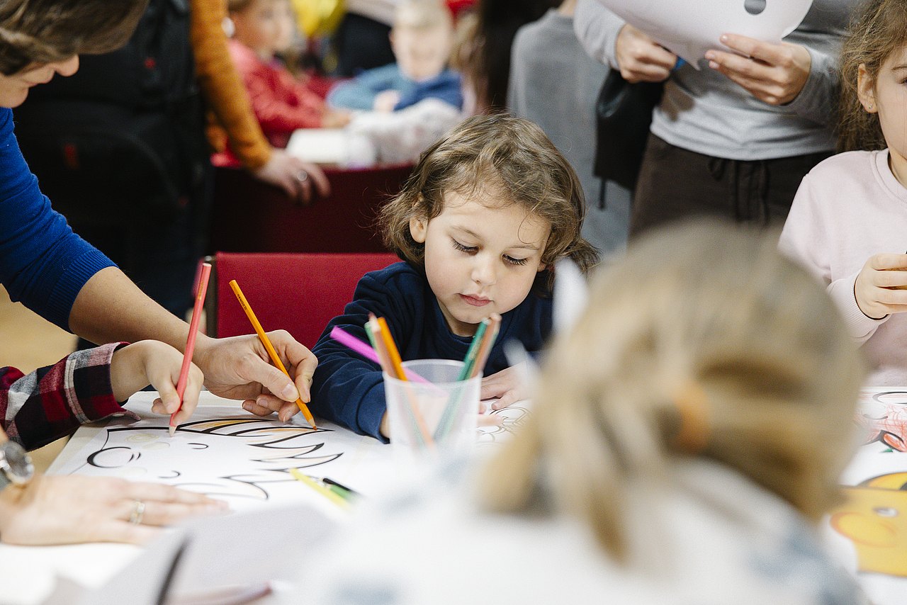 Es gibt bei jedem Termin einen Bewegungsbereich, eine Mal- und Bastelstation, die Spielebox und eine Bühnen-Show.