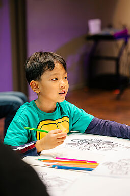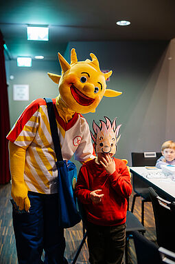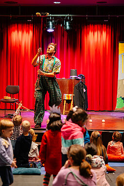 Es gibt bei jedem Termin einen Bewegungsbereich, eine Mal- und Bastelstation, die Spielebox und eine Bühnen-Show.