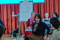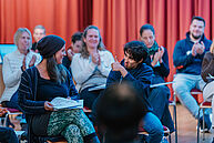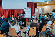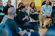 Nach den Kleingruppen-Gesprächen fassten die Fachpersonen zentrale Gedanken und Ergebnisse aus ihrer Gruppe für alle zusammen und es gab ein gemeinsames Gespräch mit Fragen aus dem Publikum.