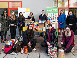Schüler_innen der HLW Sta. Christiana bringen mehrere Bananenschachteln, gefüllt mit Lebensmittelspenden und Hygieneartikeln ins Nachbarschaftszentrum des Hilfswerks am Schöpfwerk. Mit ihrem freiwilligen Engagement leisten die Jugendlichen einen Beitrag gegen Armut. Im Nachbarschaftszentrum werden die Spenden in der Sozialen Orientierungsberatung an Menschen in Notlagen ausgegeben.